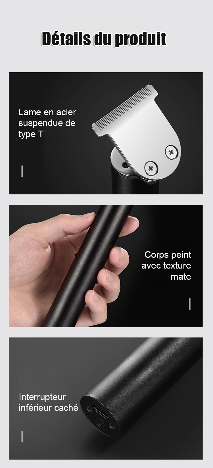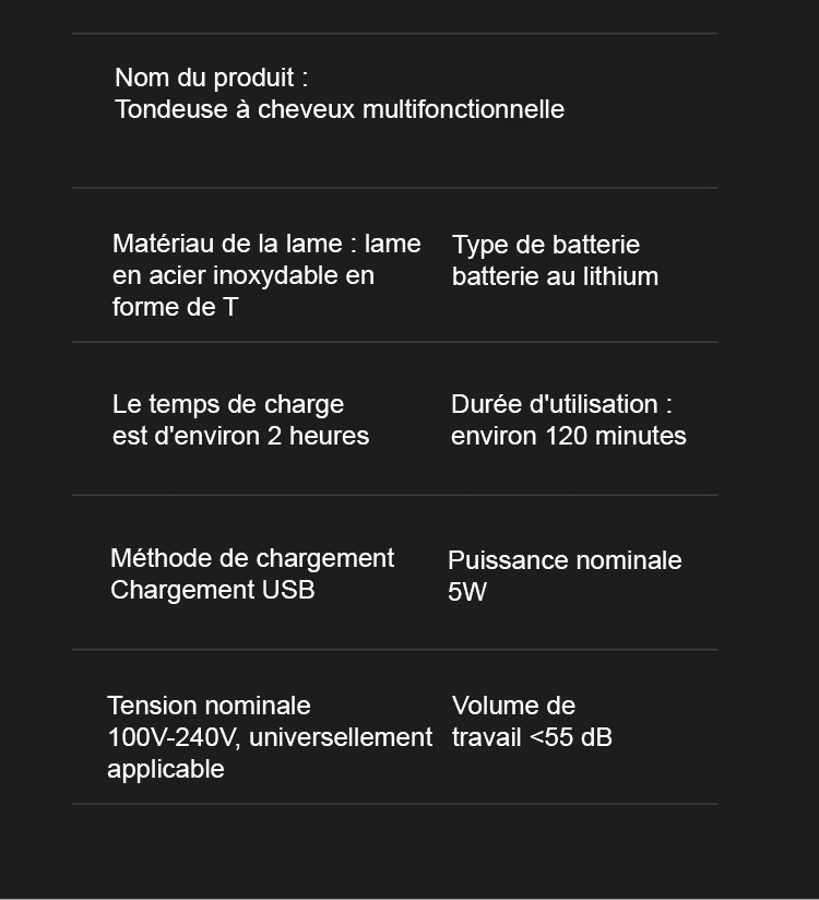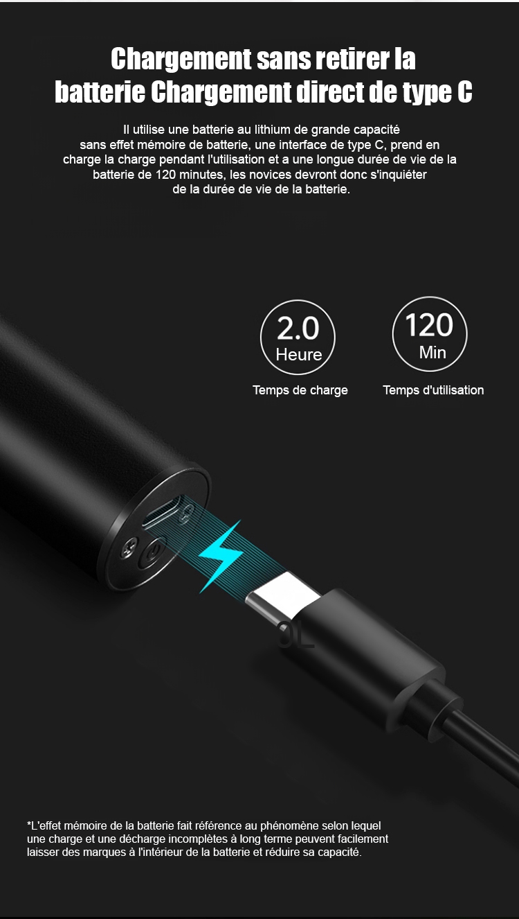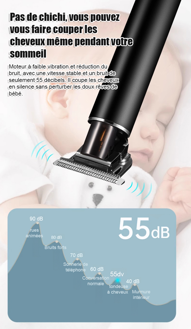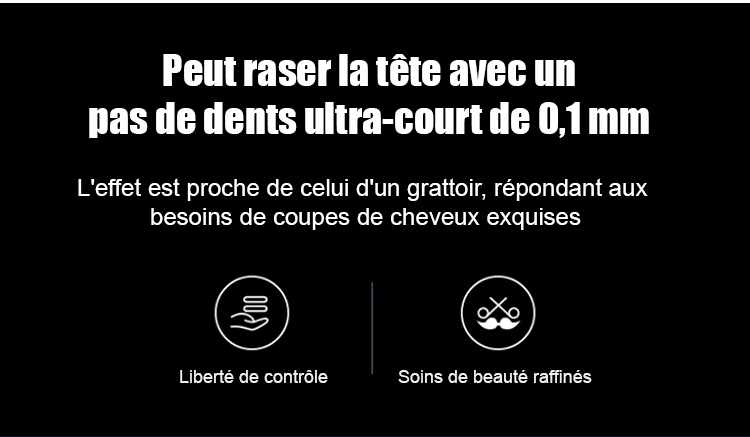 Obtenez un rasage et une coupe de cheveux parfaits en 3 secondes. Après utilisation, rincez-le directement à l'eau. Il est silencieux. Sa batterie ultra-performante offre jusqu'à 60 autonomies avec une seule charge. Essai gratuit de 14 jours, remboursement intégral en cas d'insatisfaction.